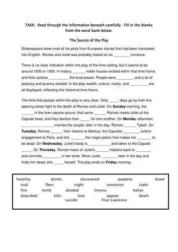 Romeo And Juliet Worksheets. Give pupils a copy of all the main character's names and ask them to work in groups to create a 'family tree ' showing the connections between the different characters. Juliet makes a plan with Friar Lawrence.
